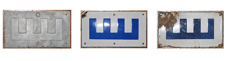 Älteste Blechversion (die blauweisse Farbe ist abgeblättert) aus der ersten Markierungszeit 1904/05, die beständigere Emailleversion aus den 20-er Jahren und die Wegemarke für das Gelände am Kammweg (1/2 Größe). © Matthias Großer - Sebnitz/Sachsen